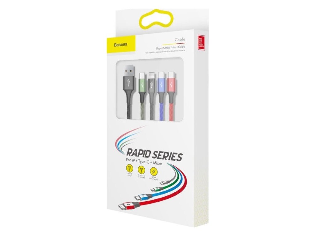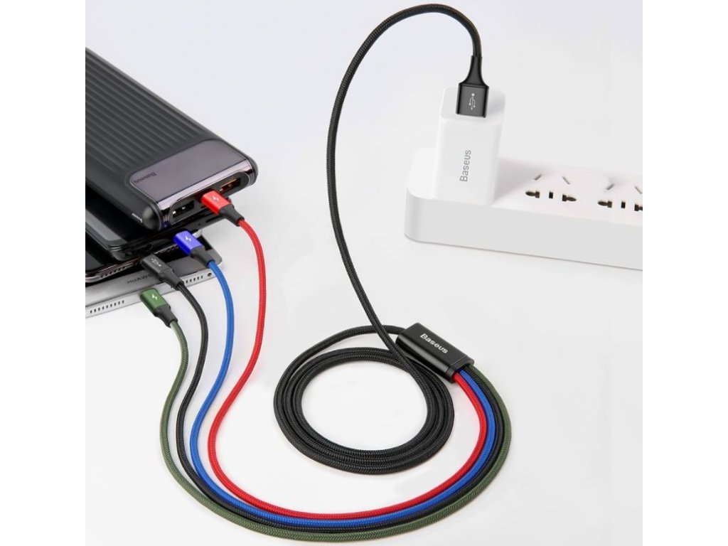 Baseus 4v1 nabíjecí kabel určený pro zařízení s USB-C, Lightning a MicroUSB zařízení. Navíc zde najdete dvě koncovky Lightning pro maximální využití všech vašich zařízení na maximum. Nabíjejte až 4 zařízení najednou. Specifikace - Materiál Aluminum Alloy+Fish opletení - Nabíjecí proud max 3.5A - Konektory MicroUSB + 2xLightning + USB-C - Pouze Lightning má i datové funkce - Délka 1.2m