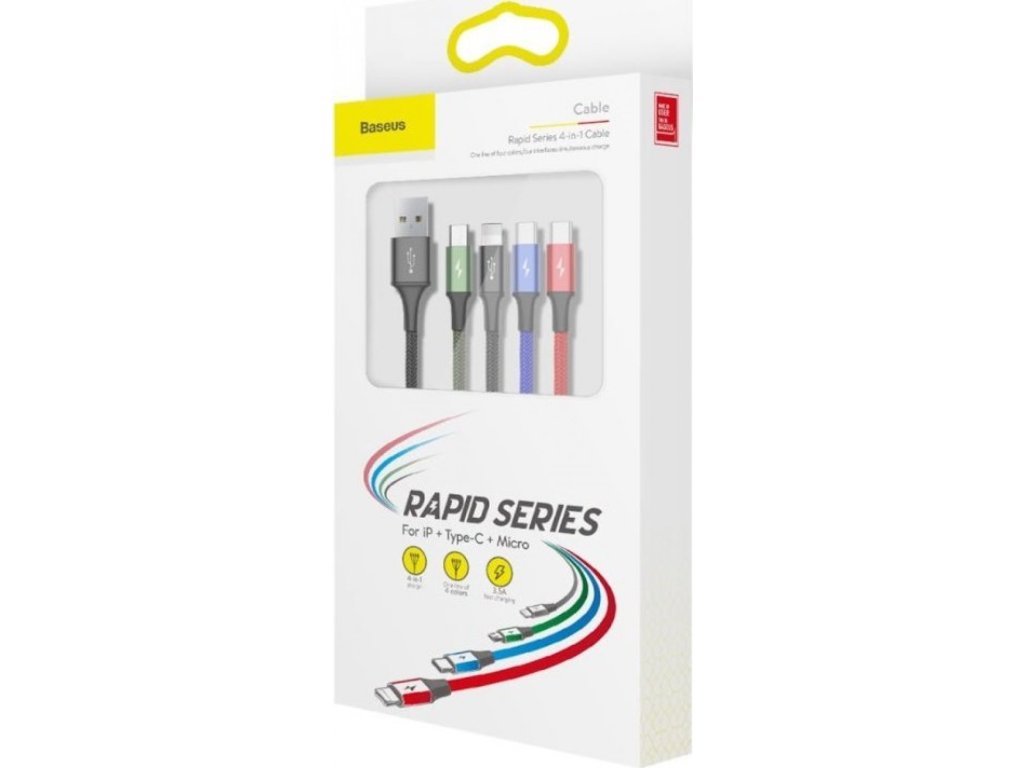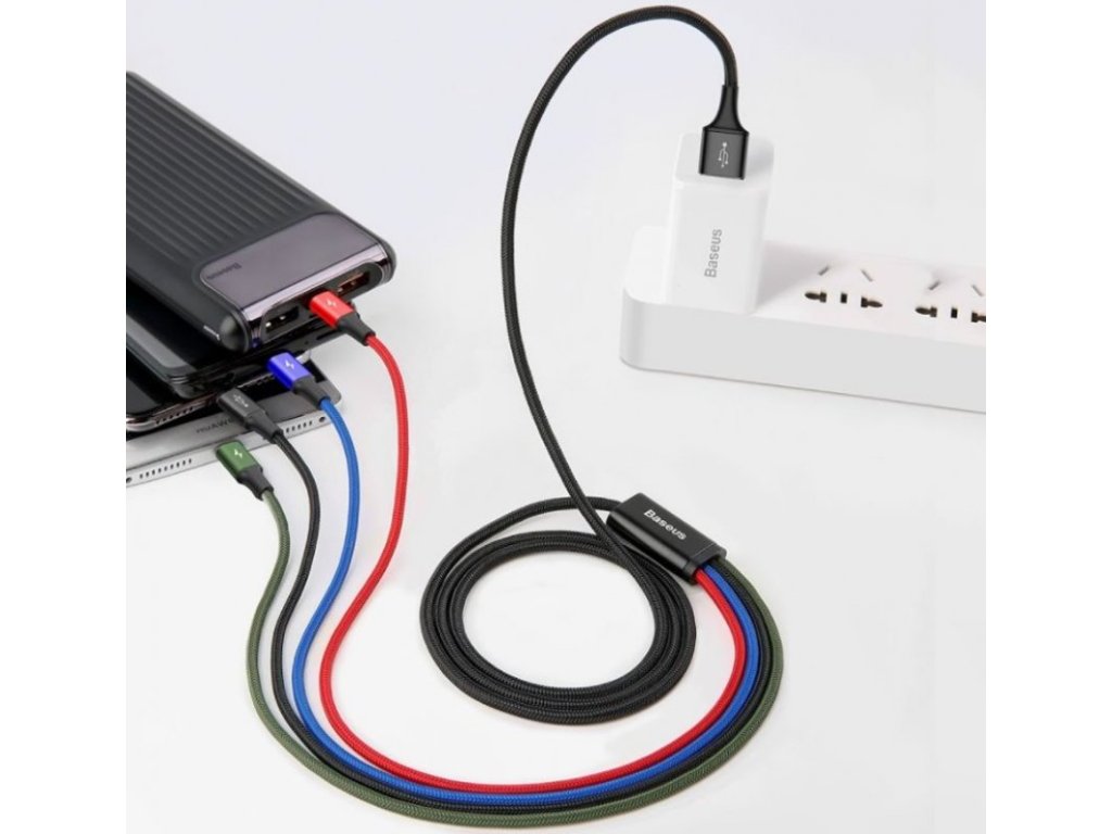 Baseus 4v1 nabíjecí a datový kabel určený pro zařízení s USB-C, Lightning a MicroUSB zařízení. Navíc zde najdete dvě koncovky USB-C pro maximální využití všech vašich zařízení na maximum. Nabíjejte až 4 zařízení najednou.