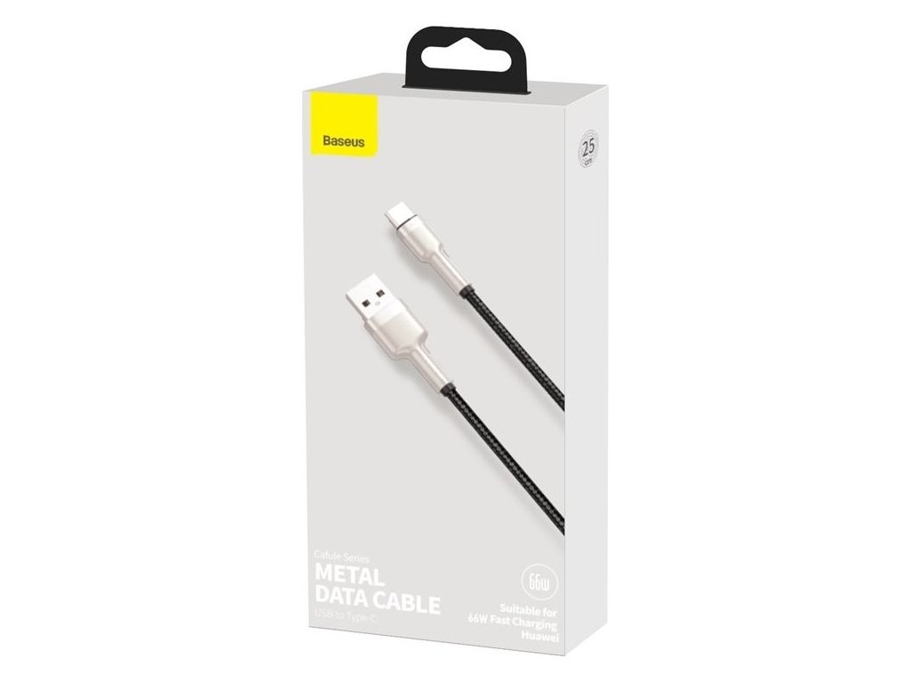 Baseus Cafule nabíjecí a datový kabel USB na USB-C kovovými koncovkami. Špičkový nabíjecí a datový kabel s nylonovým opletením pro dlouhou životnost a kovovými koncovkami. Podporuje nabíjecí výkon až 66W a je 0.25m dlouhý.