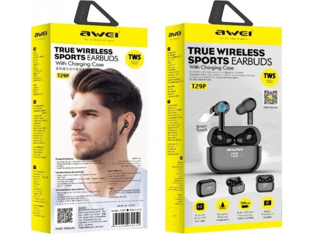 Awei T29P jsou bezdrátová Truewireless sluchátka s nabíjecím úložným pouzdrem. Vydrží přehrávat hudbu až 7 h a volat s nimi můžete až 8 hodin v kuse. Společně s pouzdrem vydrží v pohotovostním stavu 300 h. Na pouzdru svítí stav baterie, takže máte vždy přehled, kolik vám zbývá energie a kdy je třeba pouzdro dobít. Navíc ho lze nabíjet i bezdrátově. Silikonové špunty pevně drží sluchátka v uchu. Po prvním spárování se pak nadále automaticky párují s telefonem. Můžete poslouchat jen jedním sluchátkem, nebo oběma. Při používání s iPhonem je možné s nimi aktivovat Siri a položit jí dotaz. Spojení přes Bluetooth je stabilní a bez prodlev, takže se při koukání na film nebo hraní her nemusíte obávat zdržení zvuku oproti obrazu. Vzít si je můžete i na běhání nebo do tělocvičny, jsou certifikována IPX6, takže odolají kapkám vody i potu.