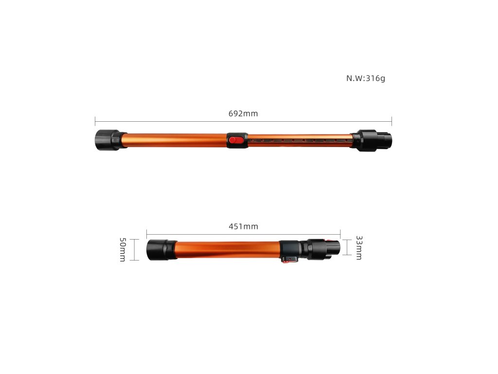 Tato výsuvná trubice je ideálním doplňkem pro vysavače Dyson V7, V8, V10 a V11. Díky teleskopické konstrukci si snadno nastavíte délku v rozmezí od 451 mm do 692 mm a přizpůsobíte ji aktuálním potřebám při vysávání. Lehký, ale odolný hliníkový materiál v prémiovém oranžovém provedení zajišťuje vysokou odolnost a dlouhou životnost.