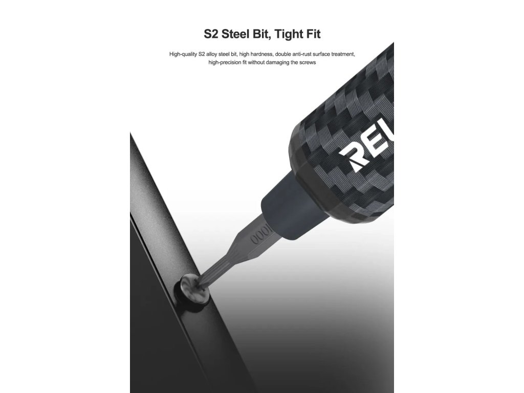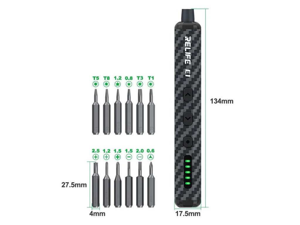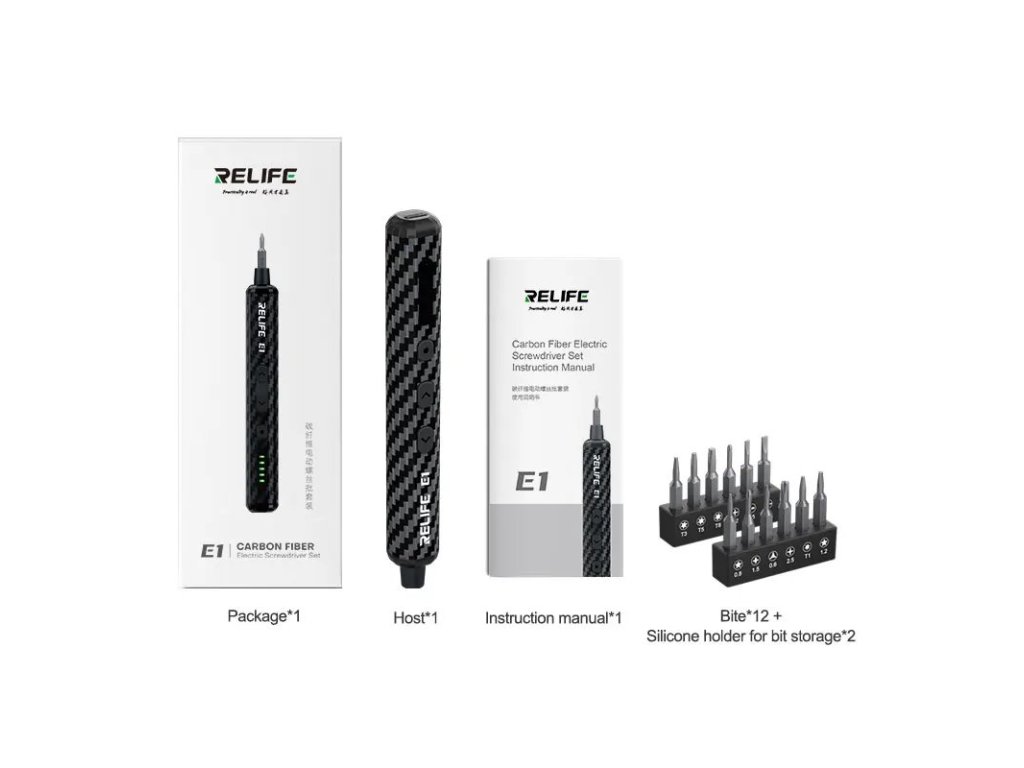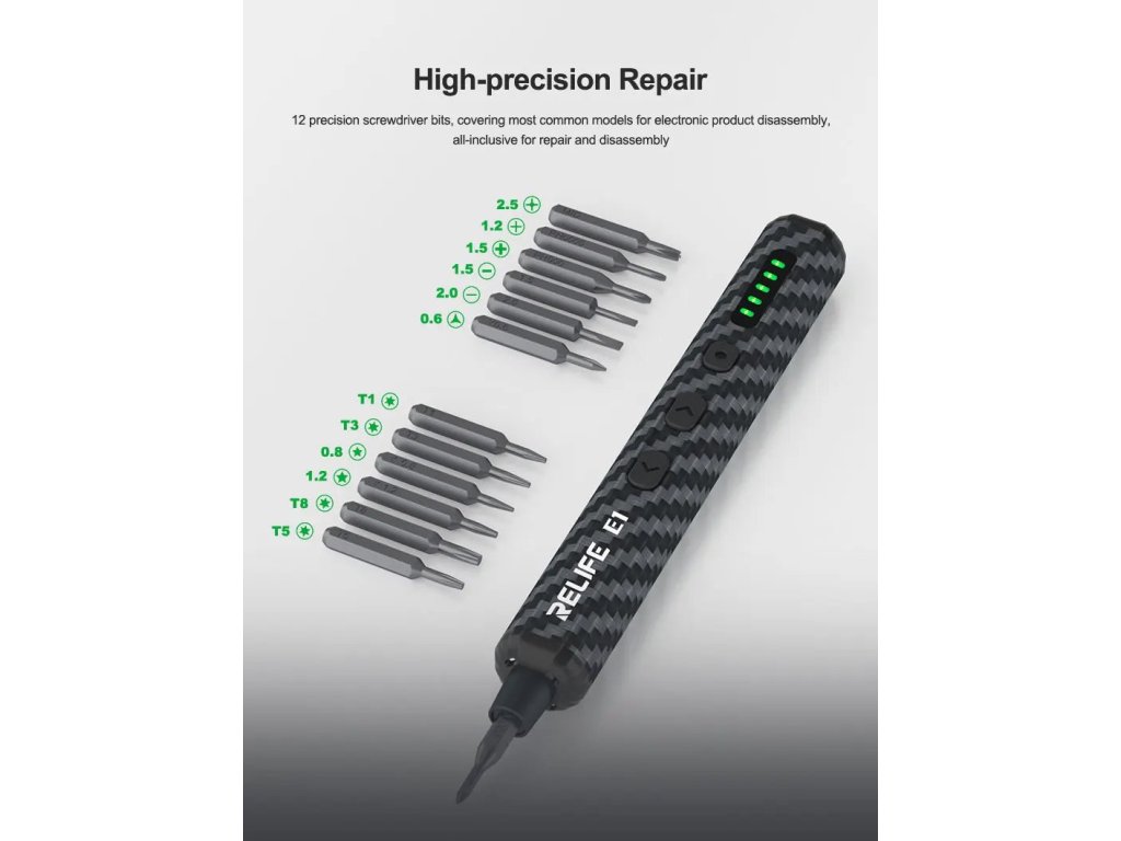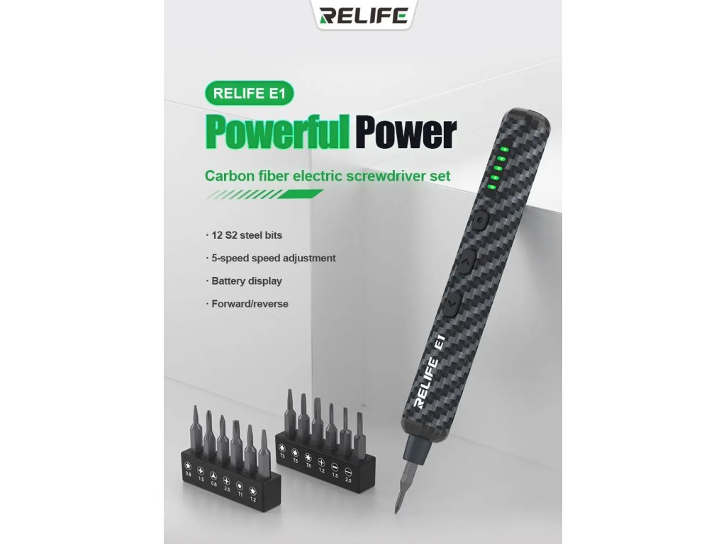 Prémiový elektrický aku šroubovák RELIFE E1 Carbon Fiber s karbonovým tělem a 12 precizními bity vyrobenými z odolné S2 oceli. Tento nástroj je určen zejména pro profesionální servis a přesné opravy mobilních telefonů, tabletů, notebooků a jiné elektroniky. Díky ergonomickému provedení, nízké hmotnosti a pohodlnému ovládání výrazně usnadňuje každodenní servisní práce.