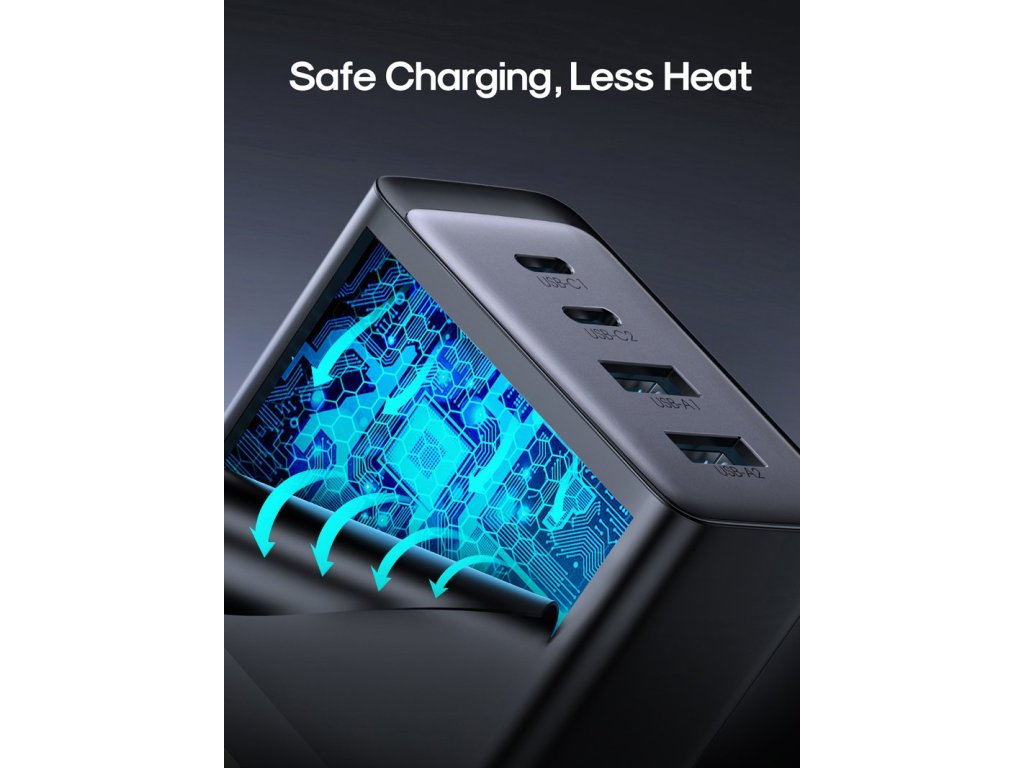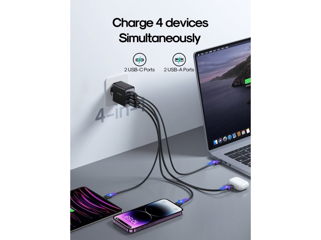 Joyroom JRTCG02 GaN Ultra je moderní stolní nabíječka, která kombinuje vysoký výkon 67 W a pokročilou GaN technologii pro efektivní a bezpečné nabíjení. Disponuje čtyřmi porty – dvěma USB-C a dvěma USB-A, takže umožňuje současně nabíjet až čtyři zařízení, včetně chytrých telefonů, tabletů, notebooků či drobného příslušenství.