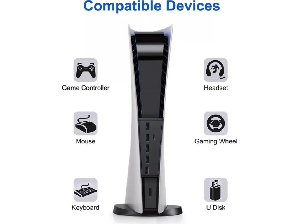 KJH PS5008 je kompaktní a elegantní rozšiřující USB hub pro konzole PlayStation 5, který nabízí 5 klasických USB portů a jeden USB-C port pro připojení periferií. Je ideální pro připojení herního příslušenství jako jsou ovladače, sluchátka, klávesnice, ventilátory nebo externí úložiště. Hub se připojuje přímo do předního portu PS5 a vizuálně s ní perfektně ladí.