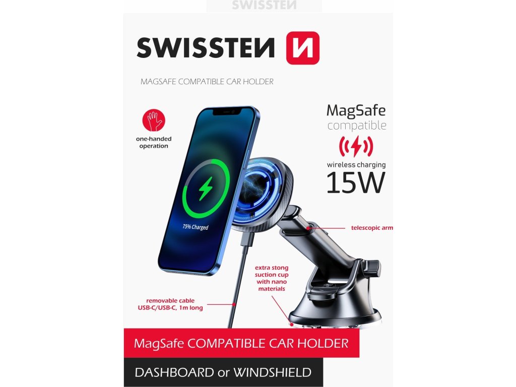 Magnetický držák s přísavkou, vysouvacím ramenem, bezdrátovým dobíjením kompatibilním s Magsafe a vysokým výkonem až 15W. Baleno v blistru SWISSTEN.
