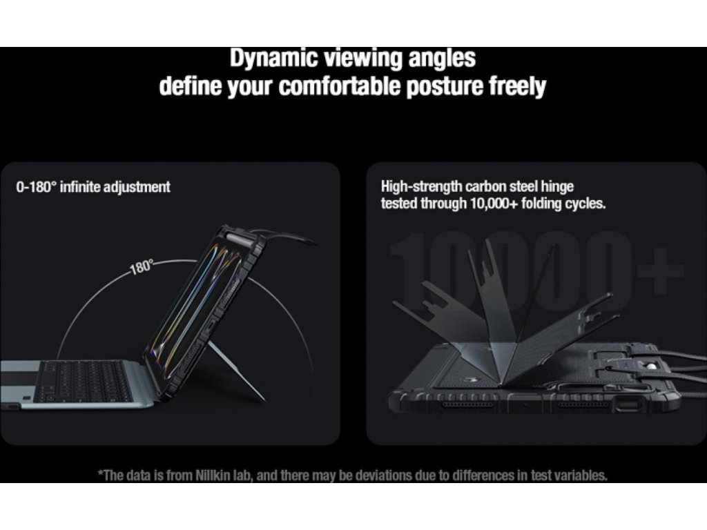 Díky zesílenému materiálu na zadním panelu a robustnímu stojanu s nastavitelným úhlem (0-180°) je obal odolný proti ohnutí, což poskytuje dodatečnou stabilitu při používání iPadu v různých režimech. Integrovaný stojan vám umožní nastavit iPad do různých poloh, což je ideální pro psaní, kreslení, sledování videí či pracovní schůzky.