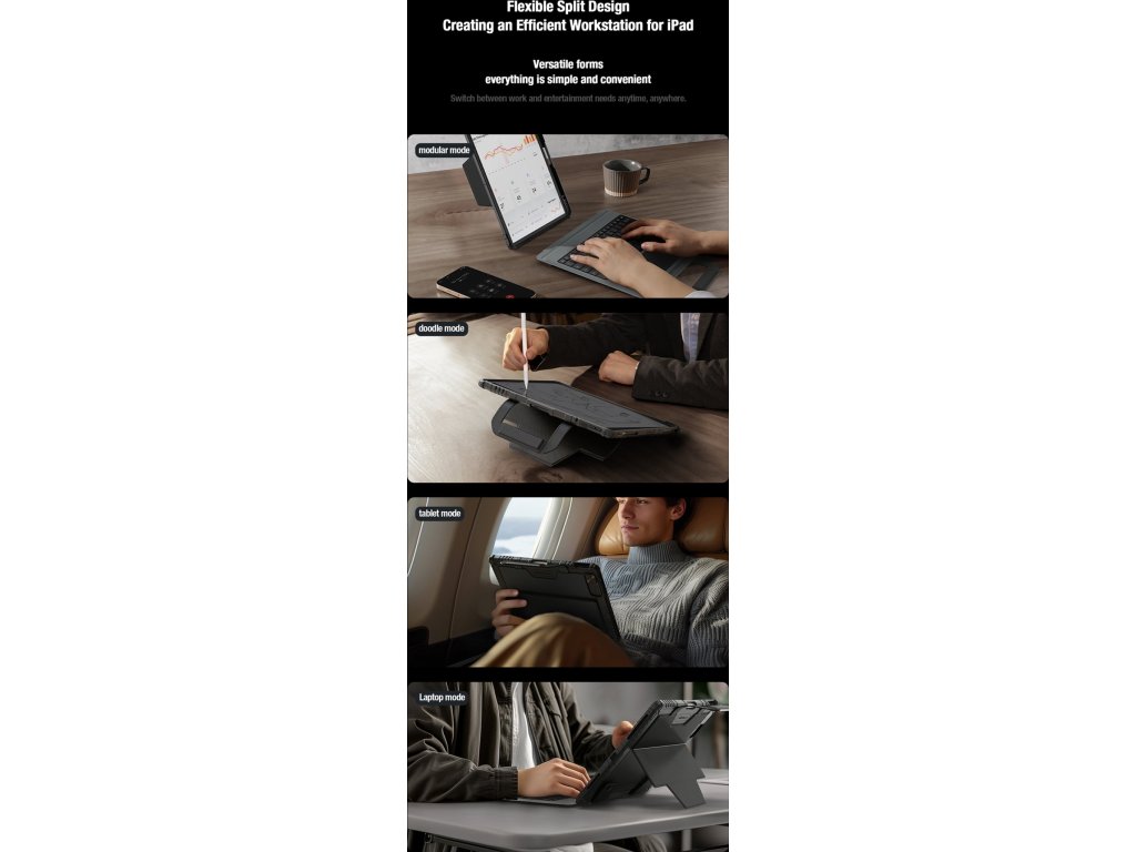 Díky zesílenému materiálu na zadním panelu a robustnímu stojanu s nastavitelným úhlem (0-180°) je obal odolný proti ohnutí, což poskytuje dodatečnou stabilitu při používání iPadu v různých režimech. Integrovaný stojan vám umožní nastavit iPad do různých poloh, což je ideální pro psaní, kreslení, sledování videí či pracovní schůzky.