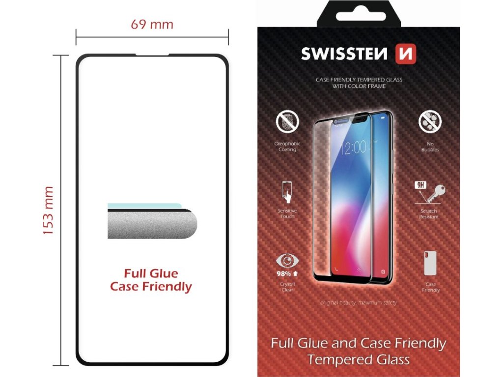 Sklo má oleofobní vrstvu, která zabraňuje ulpívání otisku prstů a tvrdost 9h. Je lepené na displej po celé ploše.Baleno v blistru SWISSTEN.