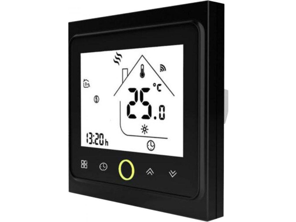 Chytrý pokojový termostat MOES slouží ke kontrole vytápění v domě pomocí chytrého telefonu nebo tabletu. Tento WiFi pokojový termostat MOES BHT-002-GB slouží k regulaci pokojové teploty na základě nastaveného programu nebo nastaveného topného režimu. Zvyšuje tak teplotní komfort místnosti a snižuje náklady na vytápění objektu. Termostat je vybaven bezdrátovým připojením WiFi. Díky tomu snadno integrujete systém do domácího prostředí a s internetovým připojením získáte přístup k ovládání odkudkoli. Termostat využívá dnes již běžné technologie vzdáleného serveru, přes který dokáže komunikovat s telefonem i mimo Vaší WiFi síť. Termostat je vhodný k ovládání přímotopů, elektrických podlahových systémů a topných kabelů.