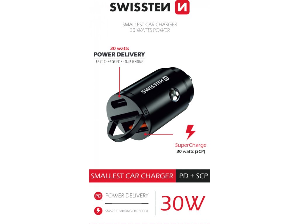 Nano autonabíječka SWISSTEN s výstupem USB-C Power Delivery a USB SuperCharge. Celkový výstupní výkon 30W. Baleno v blistru SWISSTEN.