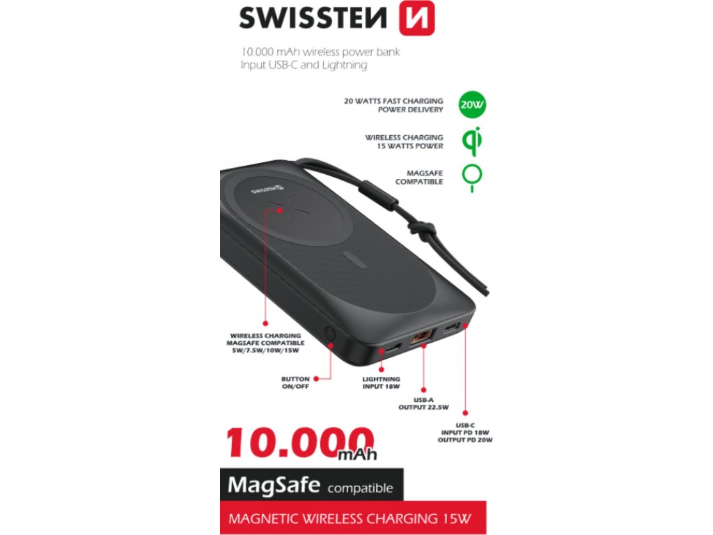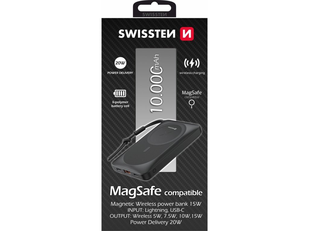 Powerbanka SWISSTEN s kapacitou 10.000mAh, rychlým nabíjením PD+QC a bezdrátovým nabíjení s výkonem až15W (MagSafe compatible). Baleno v blistru SWISSTEN.