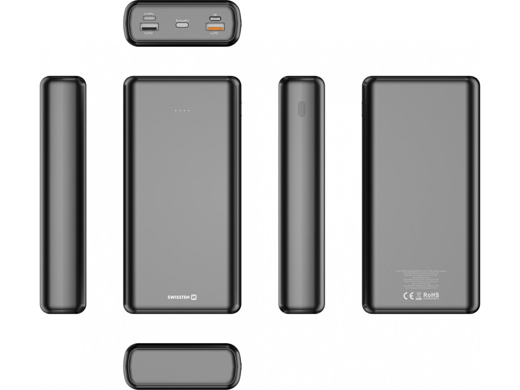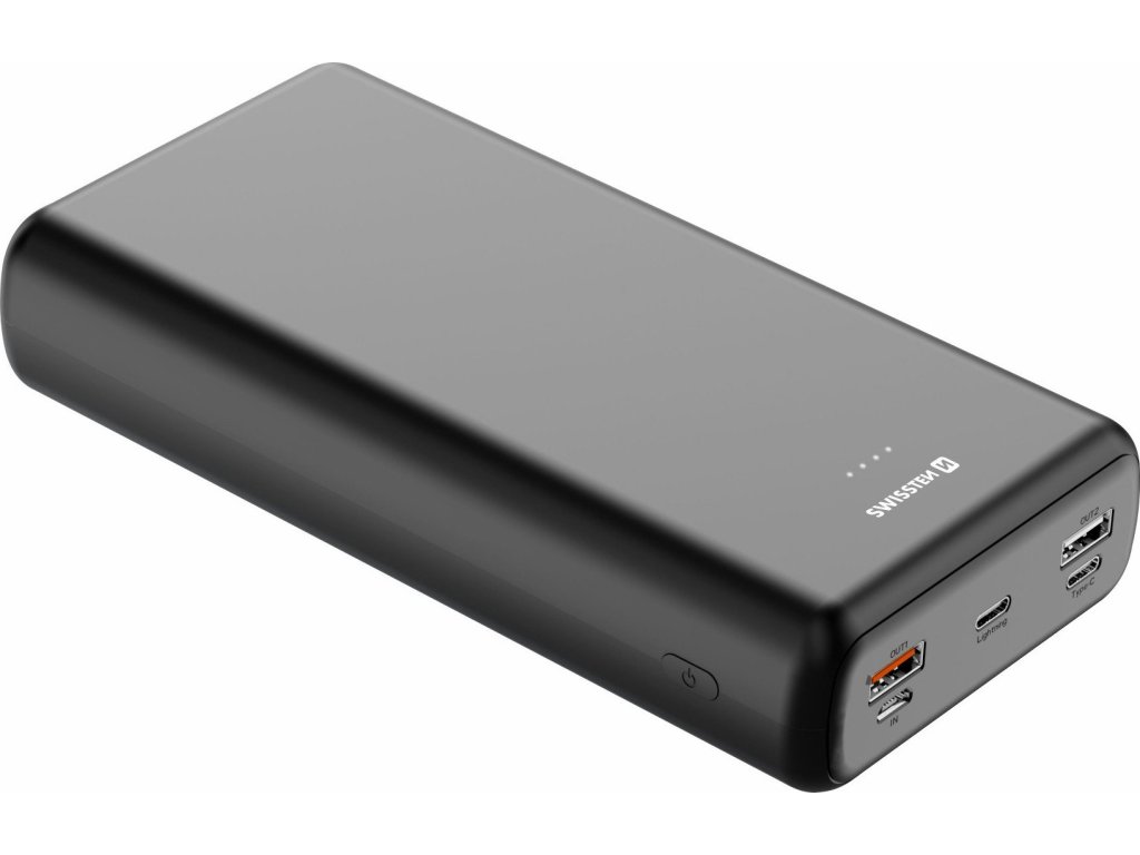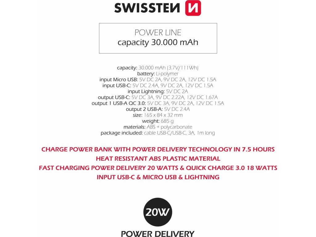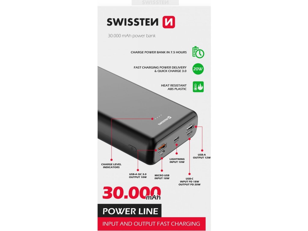 Powerbanka SWISSTEN s kapacitou 30.000 mAh se vstupy microUSB, USB-C i lightning a výstupy 2xUSB-A, USB-C a rychlým dobíjením PD a QC. Baleno v blistru SWISSTEN.