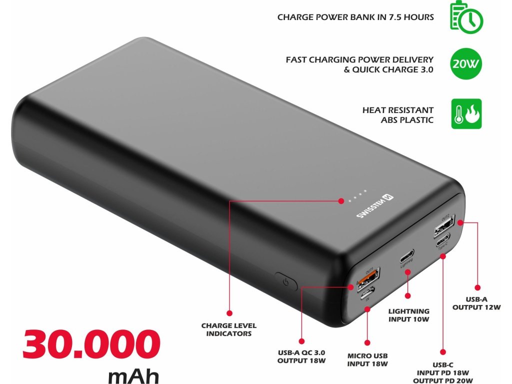 Když si položíme otázku, kde a kdy člověk potřebuje powerbanku? Vyjde z toho, že v drtivé většině případů to je při vybitém smartphonu na pár procent na pěších i cyklo výletech, dovolené pod stanem atd. Ve všech případech člověk potřebuje mít rychle nabitý telefon nebo powerbanku. Právě to Vám powerbanka SWISSTEN 30.000mAh poskytne. Jestli máte telefon s podporou rychlého nabíjení, nebo o něm uvažujete, tak je tato powerbanka ideální řešení.
