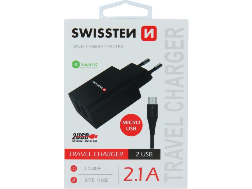 Kvalitní nabíječka s výstupním proudem 2,1A , technologií Smart IC a dvěma výstupy USB. V balení 1,2 m dlouhý microUSB kabel. Baleno v blistru SWISSTEN.