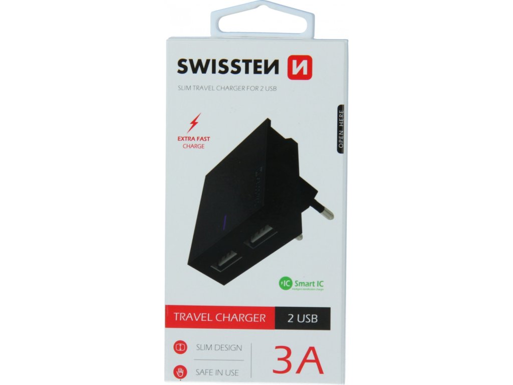 Jedinečná SLIM nabíječka s výstupním proudem 3A, technologií Smart IC, stojánkem pro umístění smartphonu, dvěma USB porty. Lze využít za nábytek, do zásuvky ve volném prostoru nebo kdekoliv jako držák smartphonu. Baleno v blistru SWISSTEN