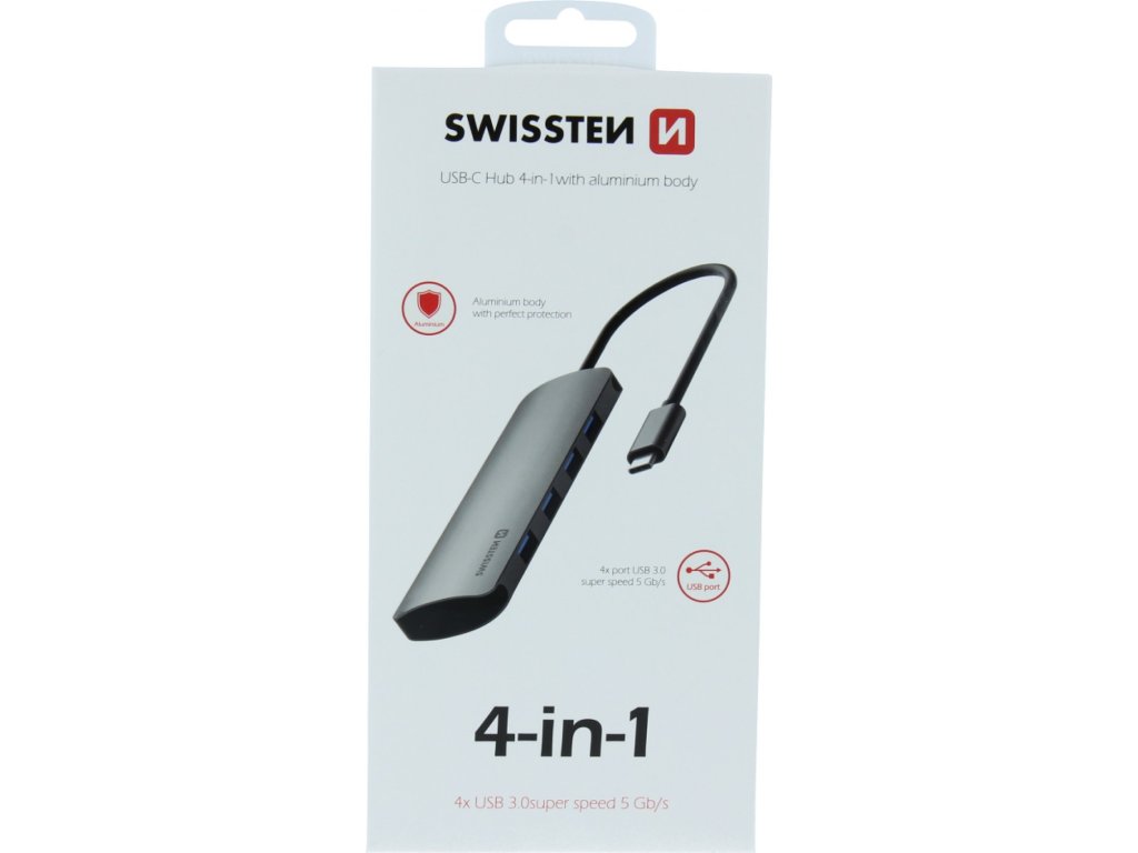 Hliníkový USB-C HUB Swissten 4v1 se čtyřmi výstupy USB 3.0 s přenosovou rychlostí 5G/s. Baleno v blistru Swissten.