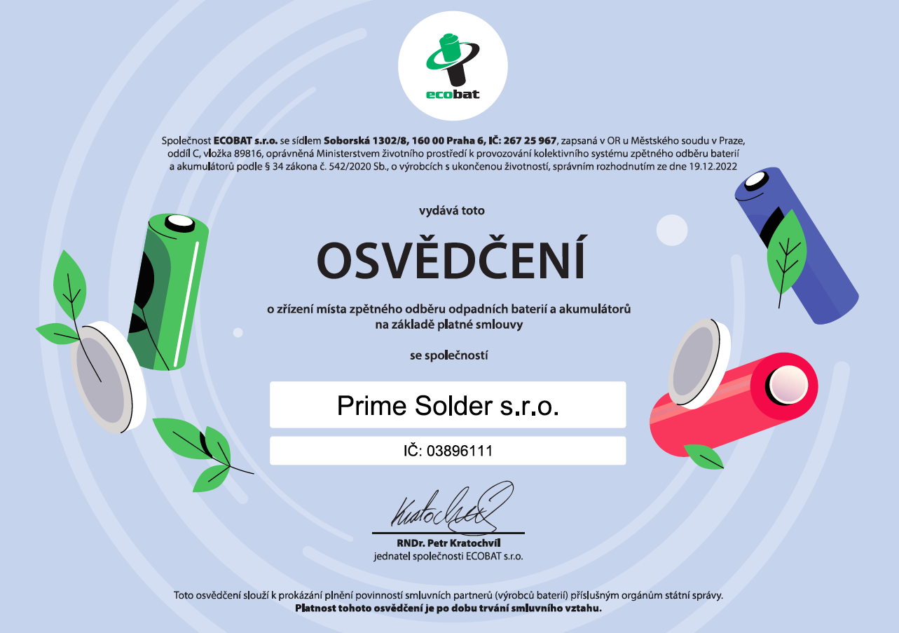 Naše společnost zajišťuje zpětný odběr použitých baterií prostřednictvím kolektivního systému Ecobat. Zákazníci mají možnost vrátit použité baterie zdarma na odběrných místech, jejichž seznam naleznete zde: https://old.ecobat.cz/mapa/. Nepoužité nebo vybité baterie prosím nevyhazujte do běžného odpadu.